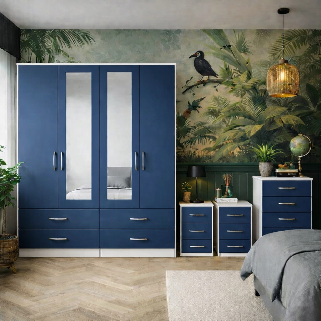 Upgrade your bedroom with this stylish and practical 4 door wardrobe set, designed to bring both elegance and everyday functionality to modern UK homes. This complete bedroom furniture set includes a spacious four-door wardrobe, a matching chest of drawers, and two bedside tables, offering a coordinated look with generous storage for your essentials.