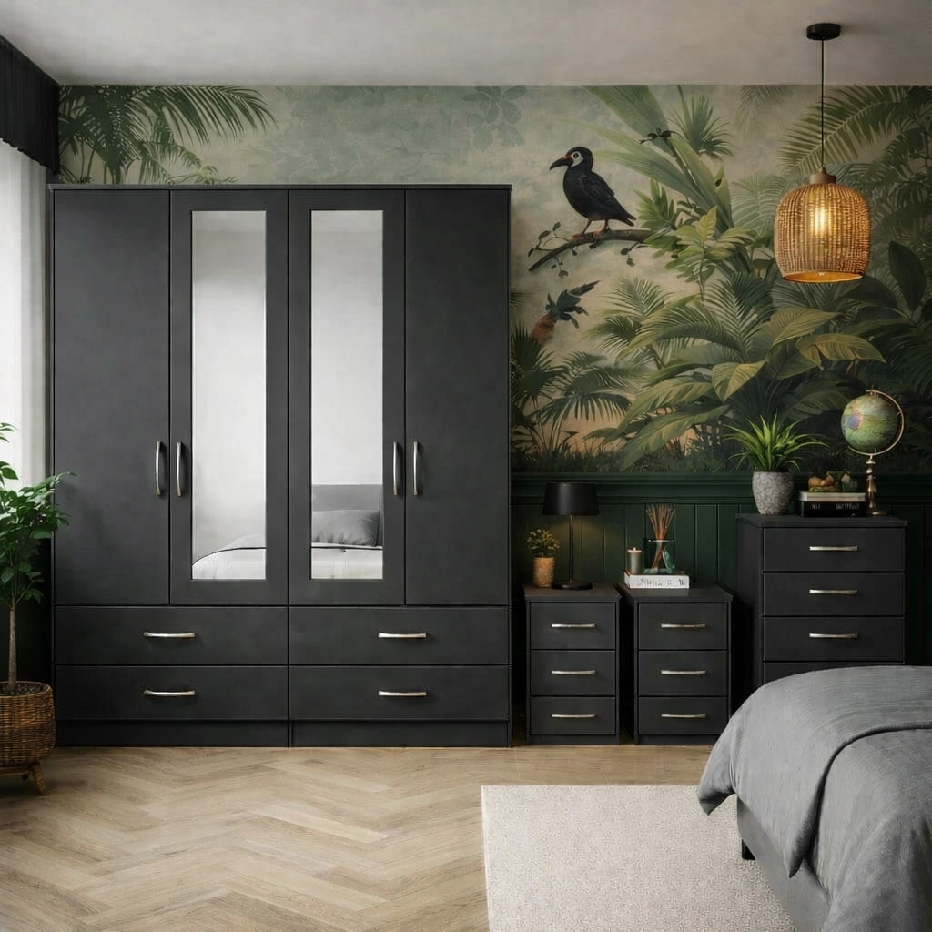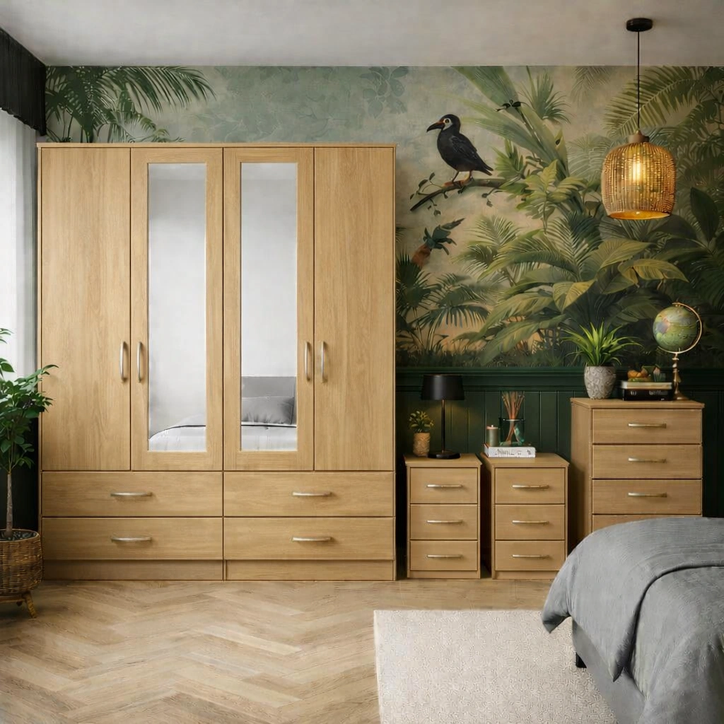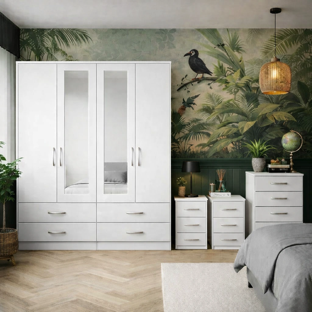 The 4 door wardrobe set provides ample hanging and shelving space, making it ideal for organising clothes, shoes, and accessories neatly in one place. Smooth-opening doors and well-proportioned internal storage ensure your belongings remain easy to access while keeping your bedroom clutter-free. The included chest of drawers adds extra storage for folded garments, while the two bedside tables are perfect for keeping nighttime essentials close at hand try Our 2 Door Wardrobe Set.