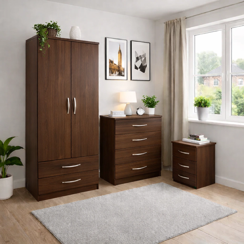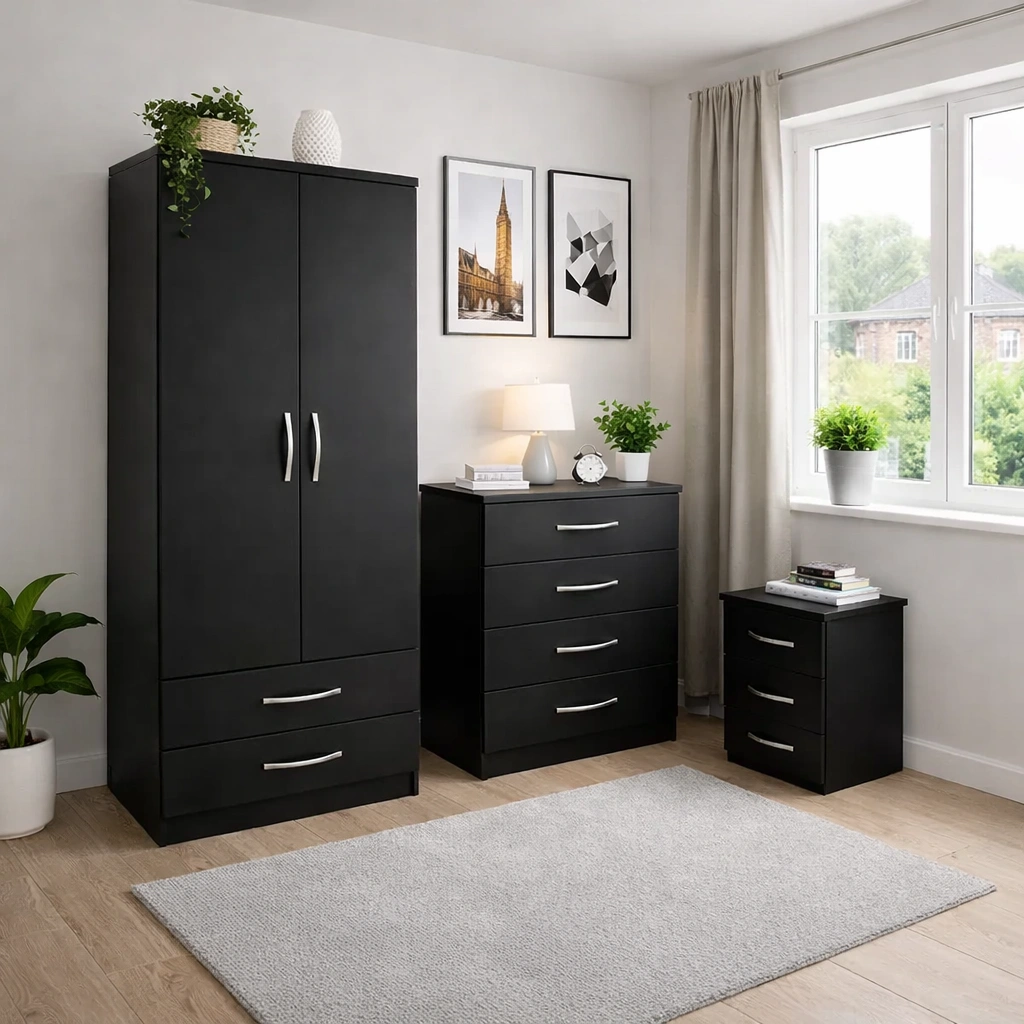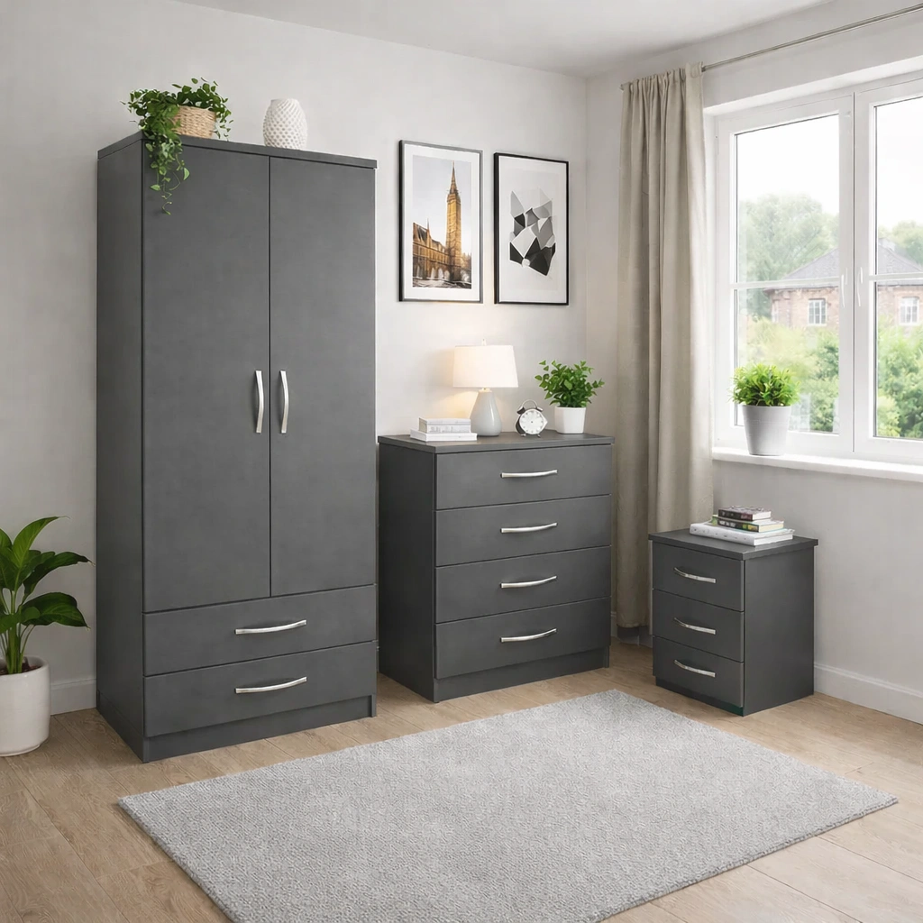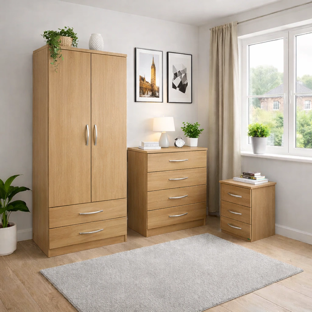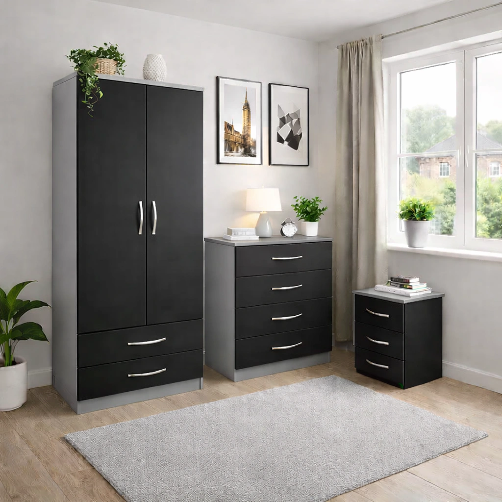 Bedroom Storage Set – 2 Door Wardrobe, Chest of Drawers & Bedside Table